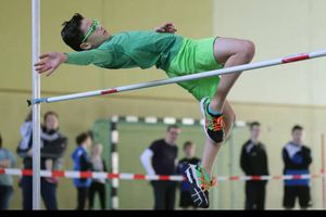 Aramis Gebhardt vom TSV Erbach übersprang bei den Hallenkreismeisterschaften in Bad König 1,30 Meter und sicherte sich damit Platz eins. Er gewann auch im Weitsprung (4,05 m) Foto: Herbert Krämer