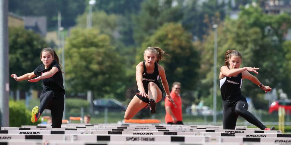 Hürdensprint über 80 Meter mit (von links) Angelina Braun, Siegerin Chiara Fischer und Malin Brinkmann (alle TSV Höchst). Foto: Joaquim Ferreira