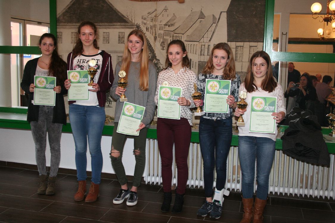 Ehrungen für Schüler und Jugendliche: Kin Jana Medelnik, Lara Bruder, Lena Geyer, Maren Guthier, Emily Kunkelmann, Hannah Nieratzky. Foto: Leichtathletikkreis