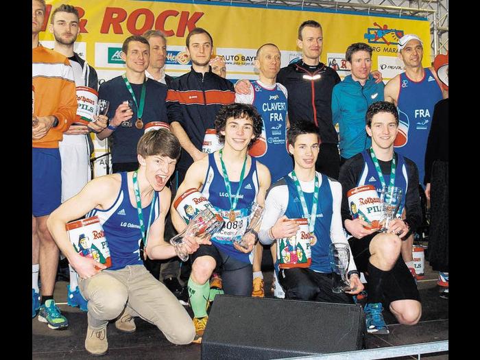 Siegerstaffel: Das Team der LG Odenwald mit (vorne, von links) Leonard Blumhoff, Cedric Guthier, Jonas Uster und Andre Bickelhaupt nach dem Freíburg-Marathon. (Foto: LG Odenwald)